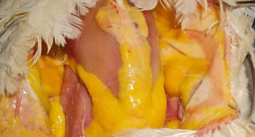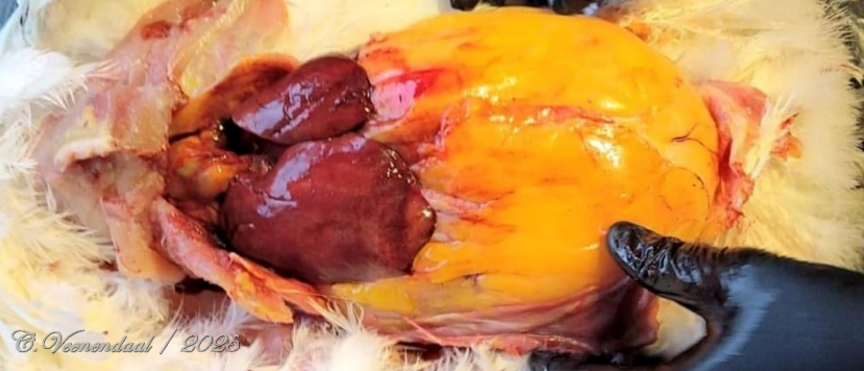 (Foto : “Een kip van anderhalf jaar, stond op beperkt voeren, stierf vlak voor het echo‑onderzoek tussen mijn vingers weg.”)