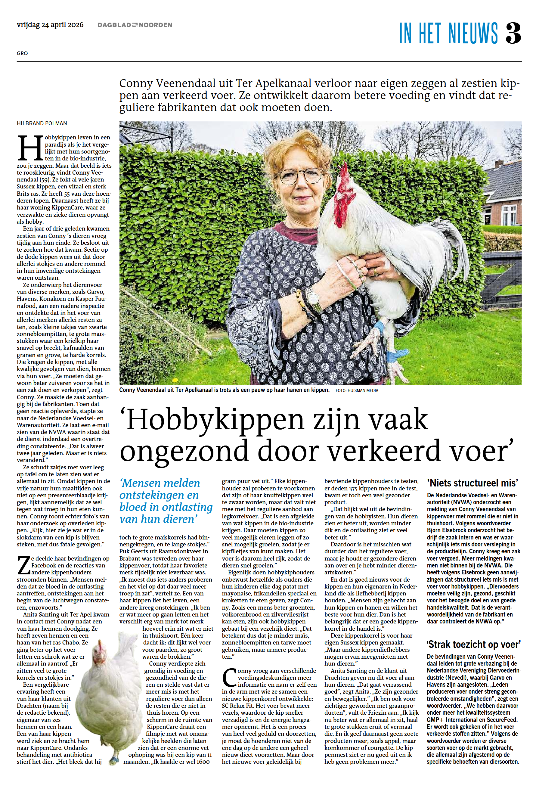 De Nederlandse Voedsel- en Warenautoriteit (NVWA) onderzocht een melding van Conny Veenendaal van kippenvoer met rommel die er niet in thuishoort. Volgens woordvoerder Bjorn Elsebrock heeft het bedrijf de zaak intern onderzocht en bleek er waarschijnlijk iets mis te zijn door versleping in de productielijn. Conny heeft een zak voer vergoed gekregen. Daarna heeft de NVWA geen meldingen meer ontvangen. De NVWA heeft volgens Elsebrock geen aanwijzingen dat er structureel iets mis is met voer voor hobbykippen. „Diervoeders moeten veilig zijn, gezond, geschikt voor het beoogde doel en van goede handelskwaliteit. Dat is de verantwoordelijkheid van de fabrikant en daar controleert de NVWA op.”