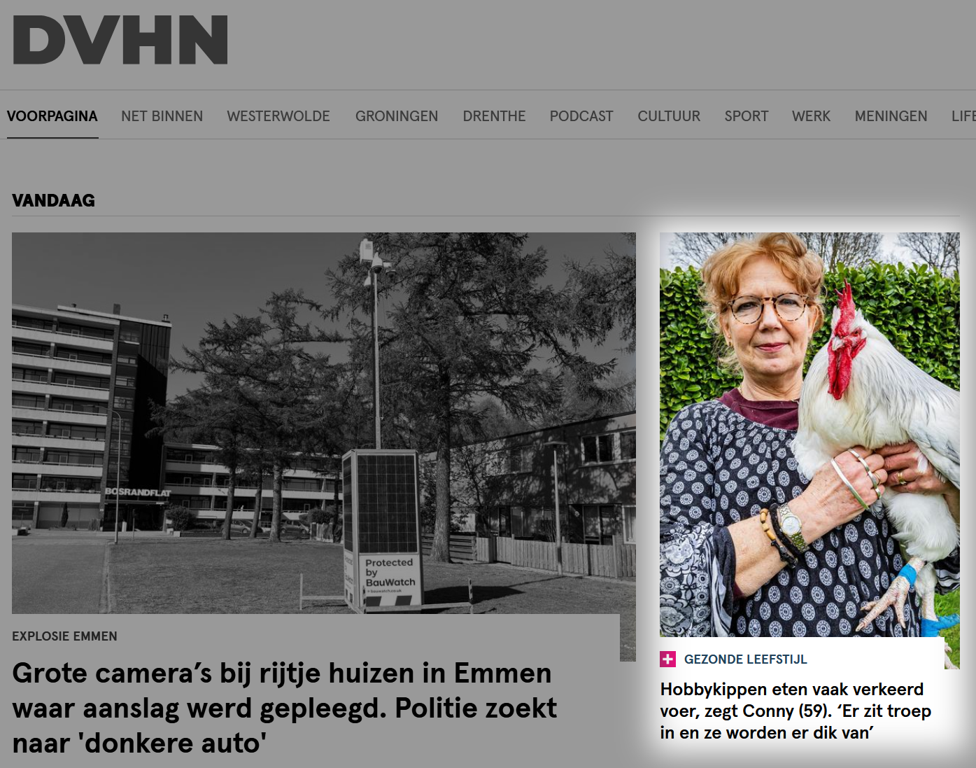 Een vergelijkbare ervaring heeft een van haar klanten uit Drachten (naam bij de redactie bekend), eigenaar van zes hennen en een haan. Een van haar kippen werd ziek en ze bracht hem naar KippenCare. Ondanks behandeling met antibiotica overleed het dier. „Het bleek dat hij toch te grote maiskorrels had binnengekregen, en te lange stokjes.”